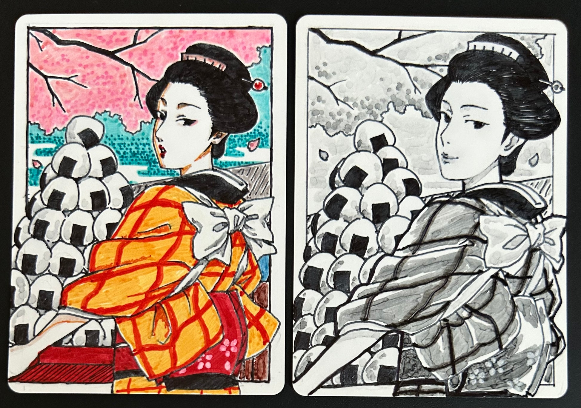 ブランクカードスケッチは見本写真のようにブランクカードの内側の枠内へのスケッチとなります。全面へのスケッチをご希望の場合は、通常のカラースケッチまたは白黒スケッチをご選択ください。